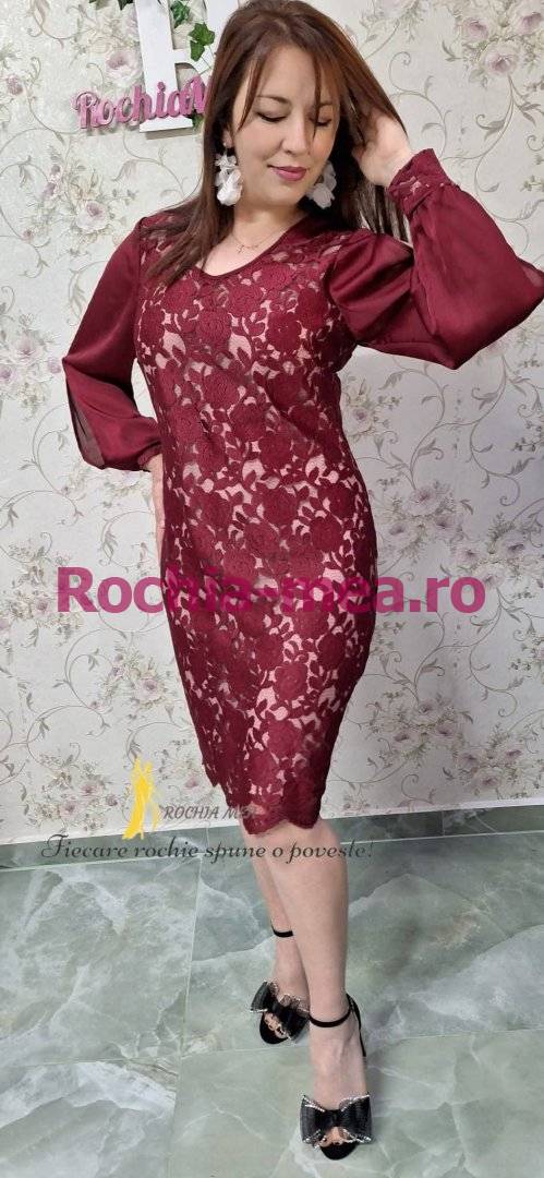 Comanda instant - Rochie bordo din dantela cu maneci despicate si dublura bej
