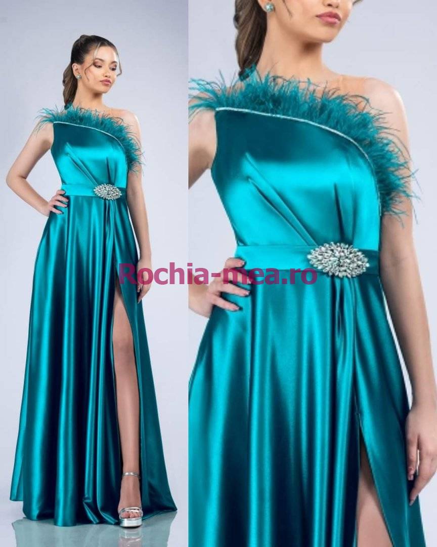 Rochie din tafta turcoaz cu pene si tull pe umar. |