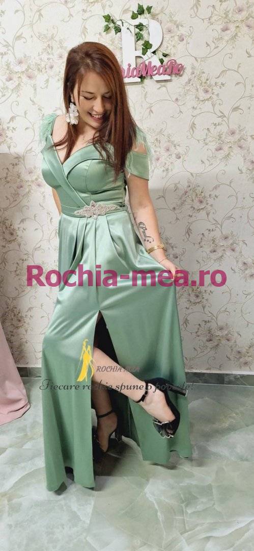 Comanda instant - Rochie Ivona verde deschis cu pene si accesoriu